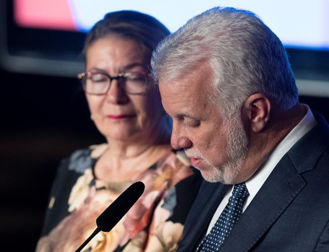 Quebec Liberal Leader Philippe Couillard looks down at his speech as he speaks to supporters after he lost the general election to a majority CAQ government, Monday, October 1, 2018 in Saint-Felicien, Quebec. Couillard's wife Suzanne Pilote looks on. THE CANADIAN PRESS/Jacques Boissinot