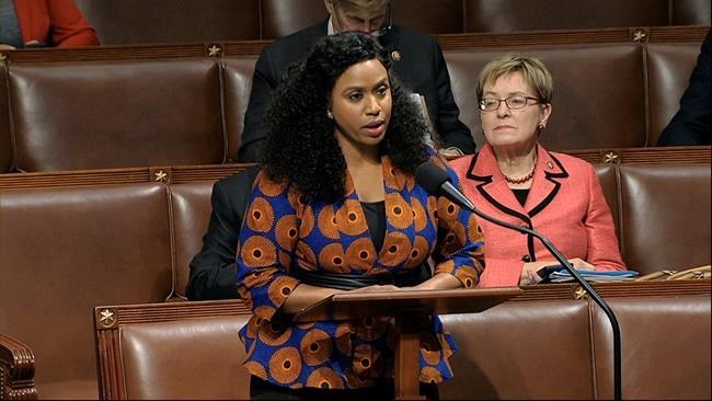 Rep. Ayanna Pressley, D-Mass., speaks as the House of Representatives debates the articles of impeachment against President Donald Trump at the Capitol in Washington, Wednesday, Dec. 18, 2019. (House Television via AP)