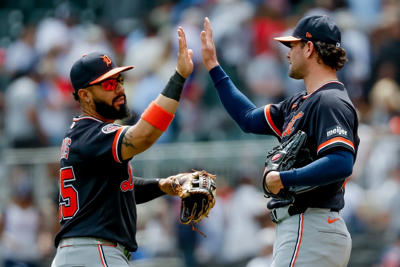 Detroit Tigers second baseman Gleyber Torres, left, celebrates with pitcher Kyle Finnegan, right, after the Tigers defeated the Atlanta Braves in a baseball game, Thursday, April 30, 2026, in Atlanta. (AP Photo/Erik S. Lesser)