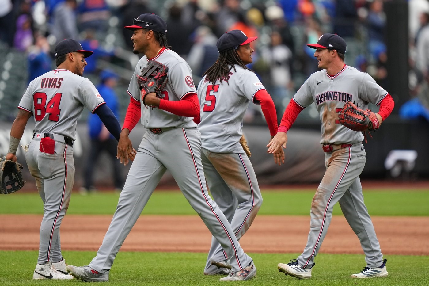 Washington Nationals' Jorbit Vivas (84) and CJ Abrams (5) celebrates with James Wood and Jacob Young after a baseball game against the New York Mets Thursday, April 30, 2026, in New York. (AP Photo/Frank Franklin II)