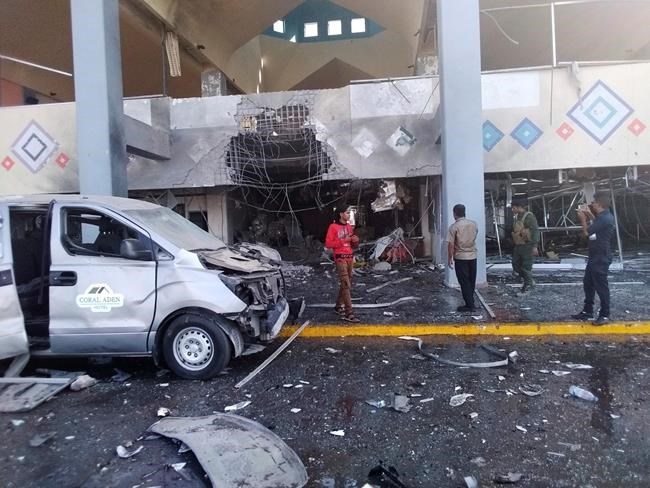 FILE - In this Wednesday, Dec. 30, 2020 file photo, bystanders and a soldier stand near a damaged portion of the airport in the southern city of Aden after an explosion. Officials said Sunday, Jan. 3, 2021, that the first commercial flight landed at the airport since the deadly missile attack last week that killed at least 25 people and wounded over a hundred others. The flight comes four days after missiles exploded just moments after a plane carrying members of Yemen’s Cabinet landed on a flight from the Saudi Arabian capital, Riyadh. (AP Photo/Majid Saleh, File)