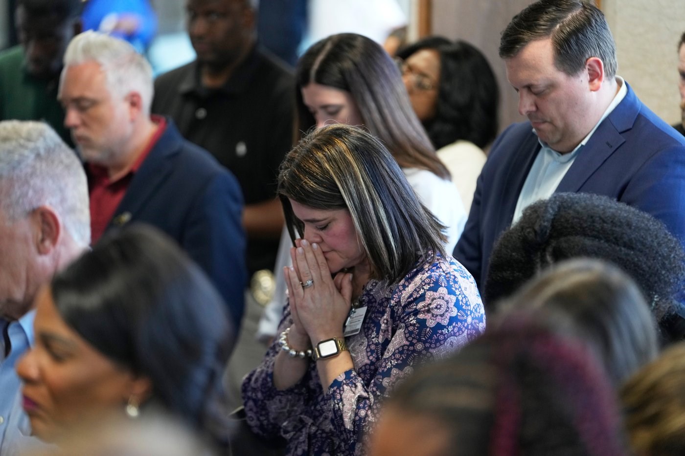 Attendees pray at the conclusion of a news conference about the children killed during a mass shooting the day before in Shreveport, La., Monday, April 20, 2026. (AP Photo/Gerald Herbert)